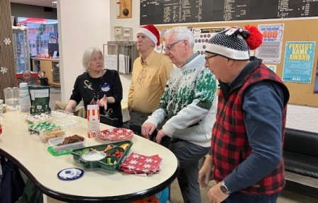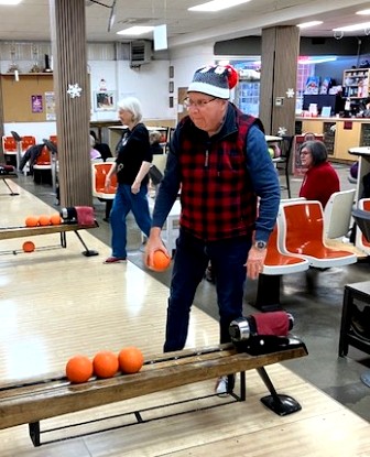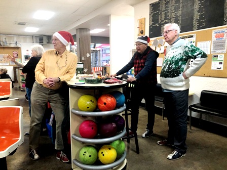 The final bowling and lunch gathering for the year took place on Wednesday, December 10 with a terrific turnout again of 12 bowling participants - Neil & Lynn Gillon, Lillian Hanson, Anne Mathisen, Rod & Lori Mundy, Bill Murray, Peggy Oldfield, Michael & Eleanor Taylor-Noonan and Ding & Marichuy Torrijos. There were treats galore to keep up everyone's strength and energy - home-made Christmas cake from Lynn Gillon, Turtles Chocolates from Bill Murray, "Just the Fun Part" Dubai Cones (milk chocolare and pistachio cream-filled wafer mini cones) from Marichu & Ding Torrijos and a Christmas Tree veggie tray, festive mini-cupcakes and cookies and jelly candy skewers from Peggy Oldfield. From Santa Hats and neckties to winter toques and sweaters to sparkly Christmas tops and Christmas light necklaces and a predominance of red, everyone was in the spirit of the season! Maurice Moses arrived at the bowling alley to observe the final moments of the Bingo Game in progress and to join Neil & Lynn, Lillian, Anne, Rod & Lori, Peggy, and Michael & Eleanor for lunch at Apollo's Restaurnt. Here's a selection of photos capturing the frivolity of the games (and check out The Gallery for the bowling team photos as well as the lunch group afterwards at Apollo's Restaurant).....
