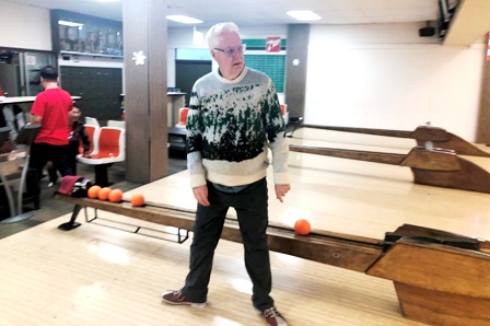 What the bowling pins see just before Neil Gillon rolls the ball.