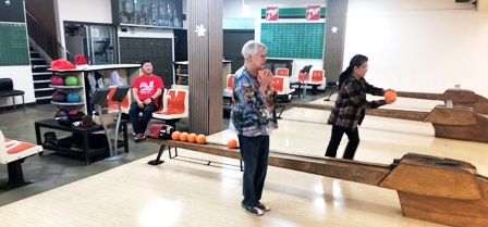 Alex Tumac, Lynn Gillon and Lillian Hanson on the bowling lanes. In the background, L-R: Alex Kerr, Ding Torrijos, Marichu Torrijos,